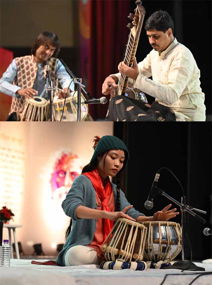 रवींद्रनाथ टैगोर विश्वविद्यालय द्वारा आयोजित विश्वरंग 2025 के तीसरे और अंतिम दिन की शुरुआत एक आध्यात्मिक, सौम्य और मन को शांत करने वाली संगीत साधना के साथ हुई। प्रातः आयोजित मंगलाचरण में मध्यप्रदेश के युवा और लोकप्रिय सितार वादक अनिरुद्ध जोशी ने अपनी मनोहारी प्रस्तुति से पूरे सभागार को मंत्रमुग्ध कर दिया। उनके सितार से निकलती स्वरलहरियों ने न केवल वातावरण को पवित्र बनाया, बल्कि प्रतिभागियों और दर्शकों को भारतीय शास्त्रीय संगीत की गहराइयों से जोड़ दिया। उनका साथ दे रहे प्रसिद्ध तबला वादक मनोज पाटीदार ने अपनी ताल और लय की अद्भुत संगति से इस प्रस्तुति को और ऊँचे सौंदर्य तक पहुँचाया, जिससे विश्वरंग के अंतिम दिन का प्रारंभ एक सांस्कृतिक उत्सव में बदल गया और आगे के सत्रों के प्रति उत्साह और अपेक्षाएँ और अधिक बढ़ गईं।