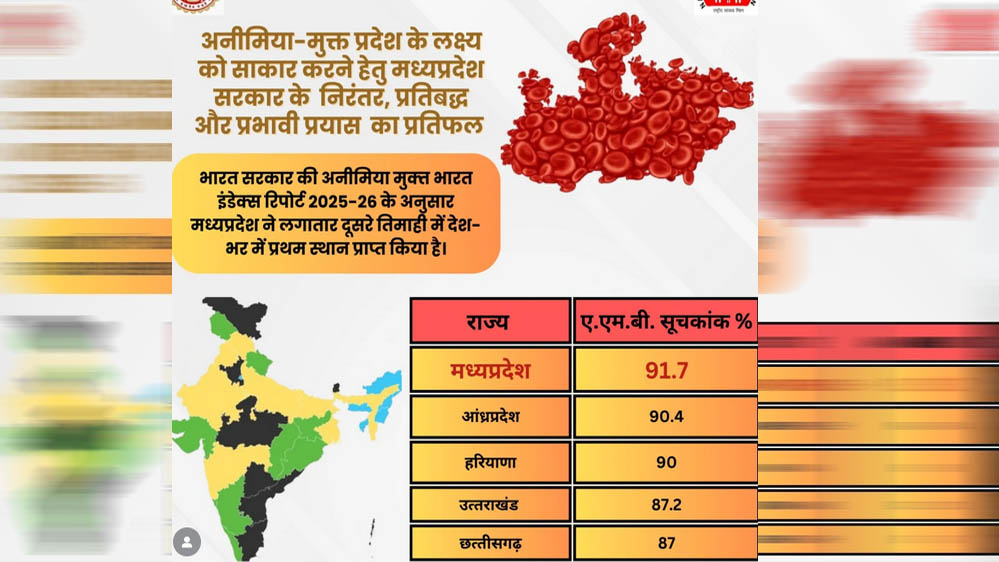एनीमिया मुक्त भारत कार्यक्रम में लगातार 2 तिमाही से मध्यप्रदेश प्रथम