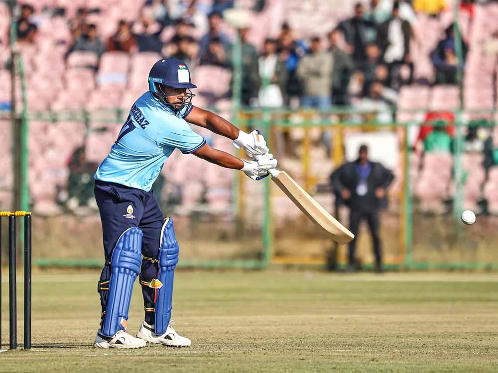 स्टार बल्लेबाज सरफराज खान ने बुधवार को विजय हजारे ट्रॉफी में अपने करियर की सबसे यादगार पारी में से एक खेली। घरेलू क्रिकेट में 'रन मशीन' के नाम से मशहूर सरफराज खान ने साल के आखिरी दिन मैदान पर गेंदबाजों की जमकर धज्जियां उड़ाई। विजय हजारे ट्रॉफी में मुंबई और गोवा के बीच खेले गए मुकाबले में सरफराज ने सिर्फ 75 गेंदों में 157 रनों की अविश्वसनीय पारी खेली। आईपीएल से पहले इस तरह की पारी खेलकर उन्होंने चेन्नई सुपर किंग्स का ध्यान अपनी ओर खींचा है, जिन्होंने इसी महीने हुई नीलामी में सरफराज खान को अपनी टीम का हिस्सा बनाया है।