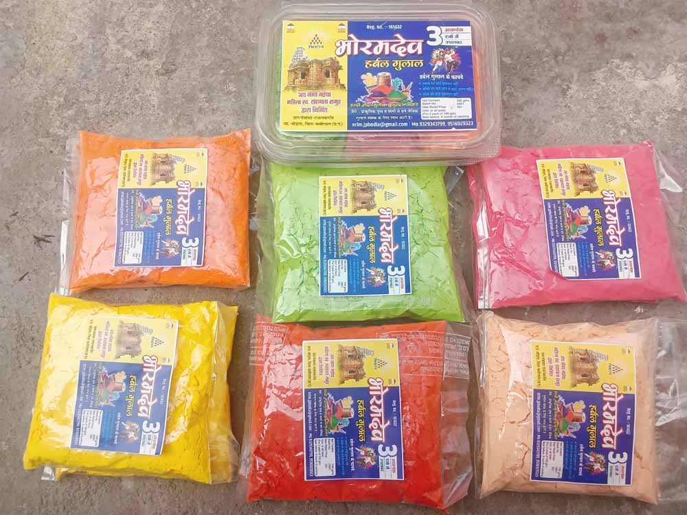 विभिन्न रंगों और आकर्षक पैकेजिंग के साथ समूह द्वारा निर्मित हर्बल गुलाल