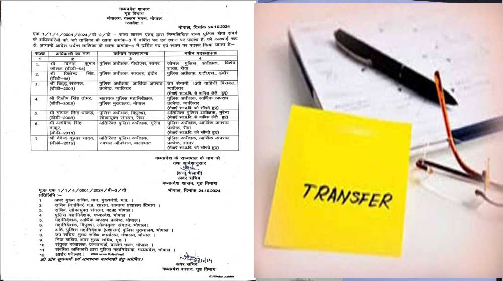 एसपी पीटीएस (सागर) दिनेश कुमार कौशल को जोनल पुलिस अधीक्षक, विशेष शाखा रीवा भेजा गया है। जबकि इंदौर के साइबर एसपी जितेंद्र सिंह को एटीएस एसपी (ATS SP) इंदौर बनाया गया है। एसपी विपुस्था लोकायुक्त संगठन रीवा, गोपाल सिंह धाकड़ को अतिरिक्त पुलिस अधीक्षक मुरैना बनाया गया है।