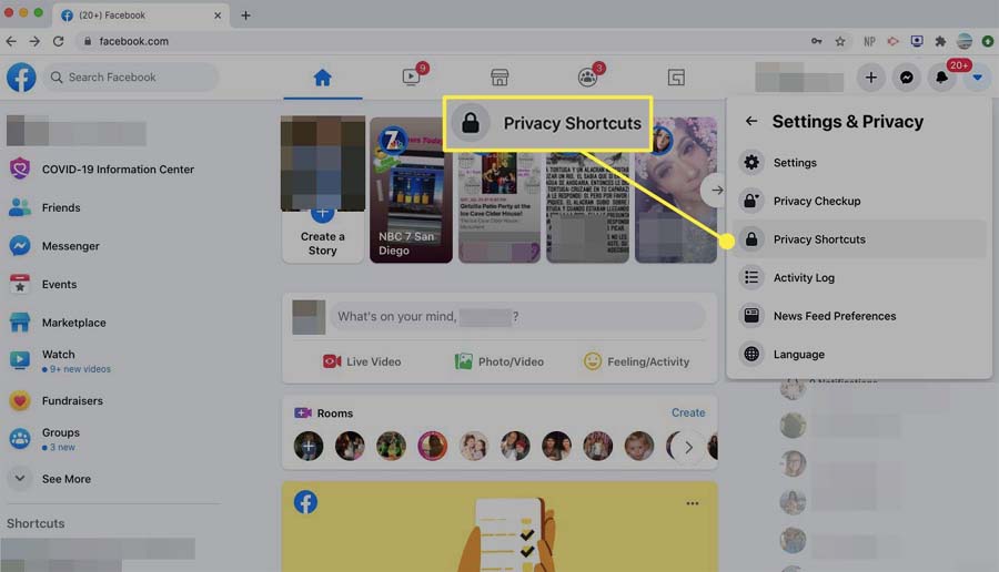 1. अपने फेसबुक प्रोफाइल पेज के बाईं ओर ऊपर की तरफ डाउन ऐरो पर क्लिक कर सेटिंग्स पर क्लिक करें।