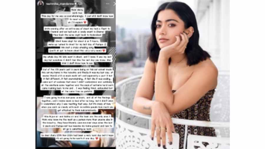 रश्मिका ने इंस्टाग्राम स्टोरीज पर अपने चाहने वालों के साथ अपनी भावनाएं शेयर की। उन्होंनने कहा कि वह बेहद ही भावुक महसूस कर रही है। उन्होंने लिखा, “पूरे दिन की शूटिंग के बाद 24 तारीख की शाम को एक कार्यक्रम में हिस्साह लेने के लिए चेन्नई की उड़ान भरी। कार्यक्रम बेहद ही अच्छाब था। ठीक उसी रात वापस हैदराबाद के लिए उड़ान भरी। घर जाकर लगभग 4 या 5 घंटे सोई। सुबह उठकर ‘पुष्पा’ के अपने आखिरी दिन की शूटिंग के लिए दौड़ी। हमने एक बेहतरीन गाना शूट किया।