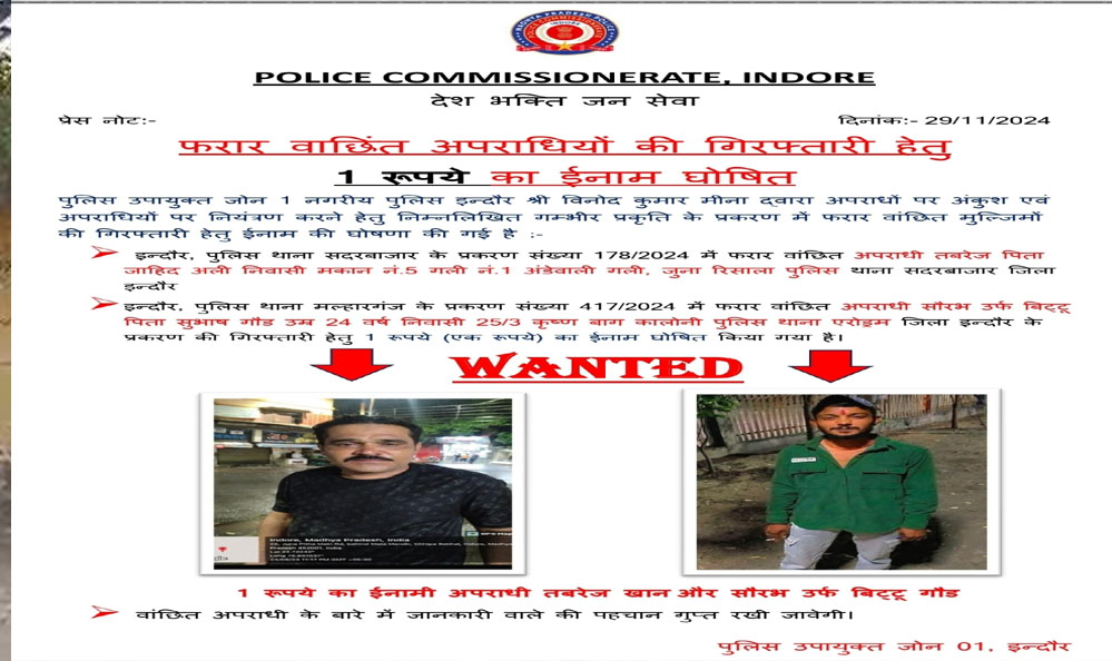 शहर में अपराधियों के खिलाफ पुलिस का अभियान लगातार जारी है। अपराधियों पर शिकंजा कसने और फरार आरोपियों की गिरफ्तारी सुनिश्चित करने के लिए पुलिस प्रशासन ने अनोखा कदम उठाया है। इंदौर के डीसीपी (डिप्टी कमिश्नर ऑफ पुलिस) ने फरार अपराधियों की सूचना देने वालों के लिए प्रतीकात्मक रूप से 1 रुपए का इनाम घोषित किया है। यह कदम अपराधियों के बढ़ते हौसले को पस्त करने के लिए है और जनता में अपराध के खिलाफ जागरूकता फैलाने के उद्देश्य से उठाया गया है।