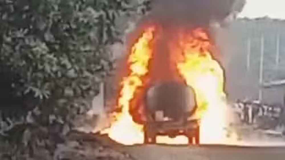 जानकारी के मुताबिक, तमनार थाना क्षेत्र मे स्थिति जिंदल कंपनी के गेट नंबर-2 के सामने खड़ी डीजल टैंकर मे रविवार की सुबह अचनाक आग लग गई और देखते ही देखते आग ने भयंकर रूप अख्तियार कर लिया। बताया जा रहा है कि आगजनी की इस घटना के समय डीजल टैंकर मे डीजल भर हुआ था। आगजनी की सूचना मिलते ही फायर ब्रिगेड और तमनार थाने की टीम तुरंत मौके पर पहुंची। आग बुझाने दमकल कर्मियों की कड़ी मशक्कत जारी है। प्रारंभिक जांच मे बताया जा रहा है कि खड़ी गाड़ी मे शॉर्ट सर्किट से आग लगने की आशंका जताई जा रही है। इस घटना मे अभी तक कोई हताहत नहीं हुई है। सुरक्षा के लिहाज से आसपास के क्षेत्र को खाली करा लिया गया है।