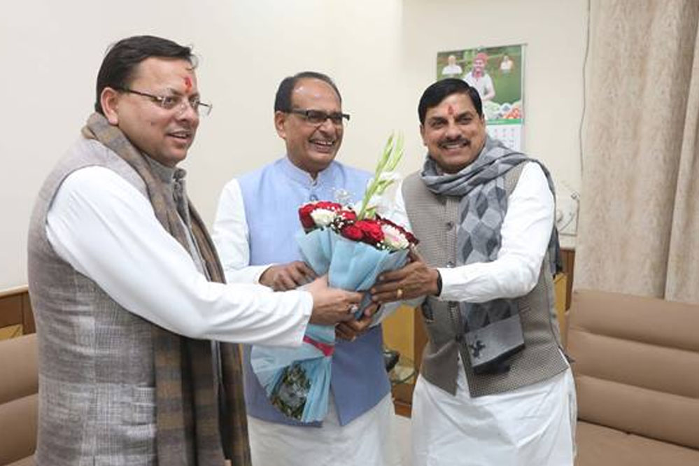 मुख्यमंत्री डॉ. मोहन यादव ने सोमवार की शाम केंद्रीय कृषि एवं ग्रामीण विकास मंत्री शिवराज सिंह चौहान से मुलाकात की। इस अवसर पर उपस्थित उत्तराखंड के मुख्यमंत्री पुष्कर सिंह धामी और मध्यप्रदेश विधान सभा के अध्यक्ष नरेंद्र सिंह तोमर ने भी केंद्रीय मंत्री चौहान से भेंट की। मुख्यमंत्री डॉ. यादव ने सागर में आयोजित कार्यक्रम से लौटने के अवसर पर केंद्रीय मंत्री चौहान से भेंट कर उनका अभिवादन किया। केंद्रीय मंत्री चौहान के पुणे से लौटने पर राजकीय विमान तल पर मुलाकातों का यह संयोग हुआ।