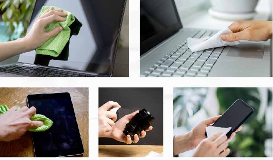 डिस्प्ले:- स्मार्टफोन हो या लैपटॉप, डिस्प्ले की सफाई करना थोड़ा आसान है। अगर आप कपड़े से डिस्प्ले की सफाई कर रहे हैं, तो इस बात का ध्यान रखें कि क्लॉथ खुरदुरा न हो। खास तौर पर पेपर टॉवल से डिस्प्ले की सफाई न करें। इससे हो सकता है स्क्रीन पर स्क्रेच मार्क आ जाएं और यह भी हो सकता है कि इससे स्क्रीन पर लगे एंटी-फिंगरप्रिंट कोटिंग भी हट जाए। इससे स्क्रीन के कुछ हिस्से भी नष्ट हो सकते हैं। स्क्रीन की सफाई के लिए पानी व किसी प्रकार के केमिकल का इस्तेमाल कभी न करें। हमेशा माइक्रोफाइबर क्लॉथ का ही इस्तेमाल करें। साथ ही एक बात का जरूर ध्यान रखें कि सफाई से पहले आपका डिवाइस स्विच ऑफ हो।