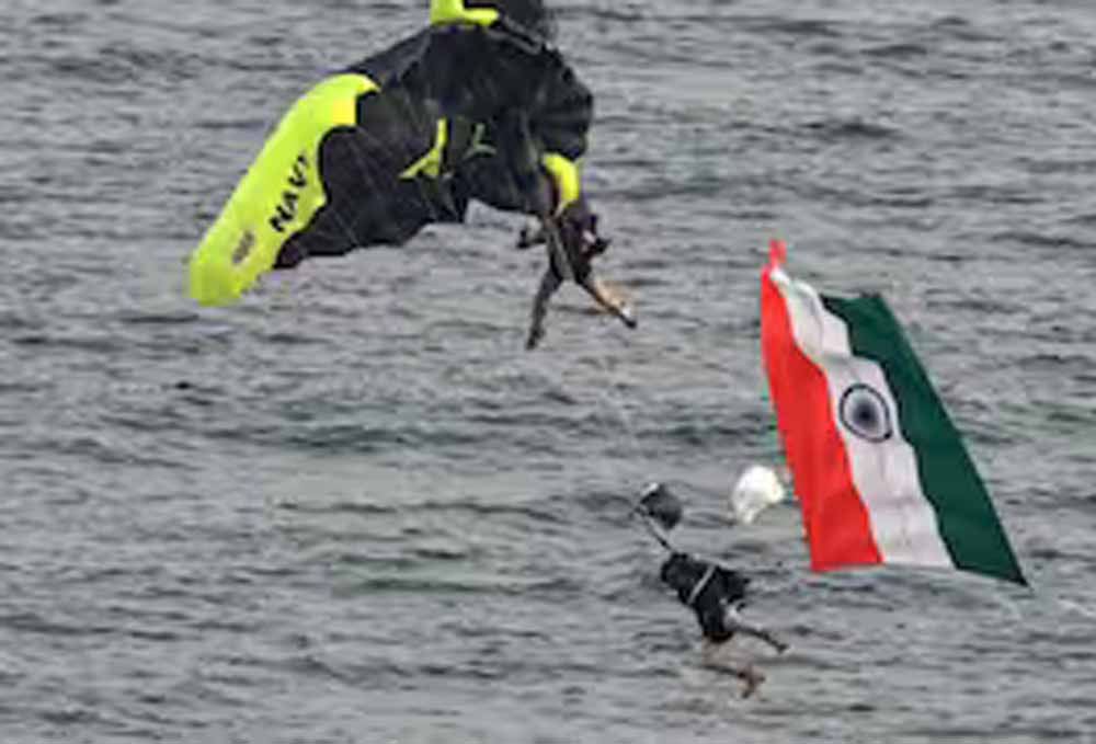 भारतीय नौसेना के दो अधिकारी ऑपरेशनल डेमोंस्ट्रेशन के रिहर्सल के दौरान एक हादसे का शिकार हो गए। उनके पैराशूट उतरने के दौरान आपस में उलझ गए, जिससे वे विशाखापट्टनम के रामकृष्ण बीच के पानी में आ गिरे। गनीमत रही कि दोनों अधिकारी सुरक्षित बच गए। हादसा उस वक्त हुआ जब पूर्वी नौसेना कमान के ऑपरेशनल डेमोंस्ट्रेशन की तैयारी चल रही थी। वीडियो में देखा गया कि दोनों अधिकारी पैराशूट लिए आसमान में उड़ रहे थे। उनमें से एक के पास राष्ट्रीय ध्वज था। लेकिन उतरने के दौरान उनके पैराशूट आपस में ही उलझ गए और वे समुद्र में गिर गए।