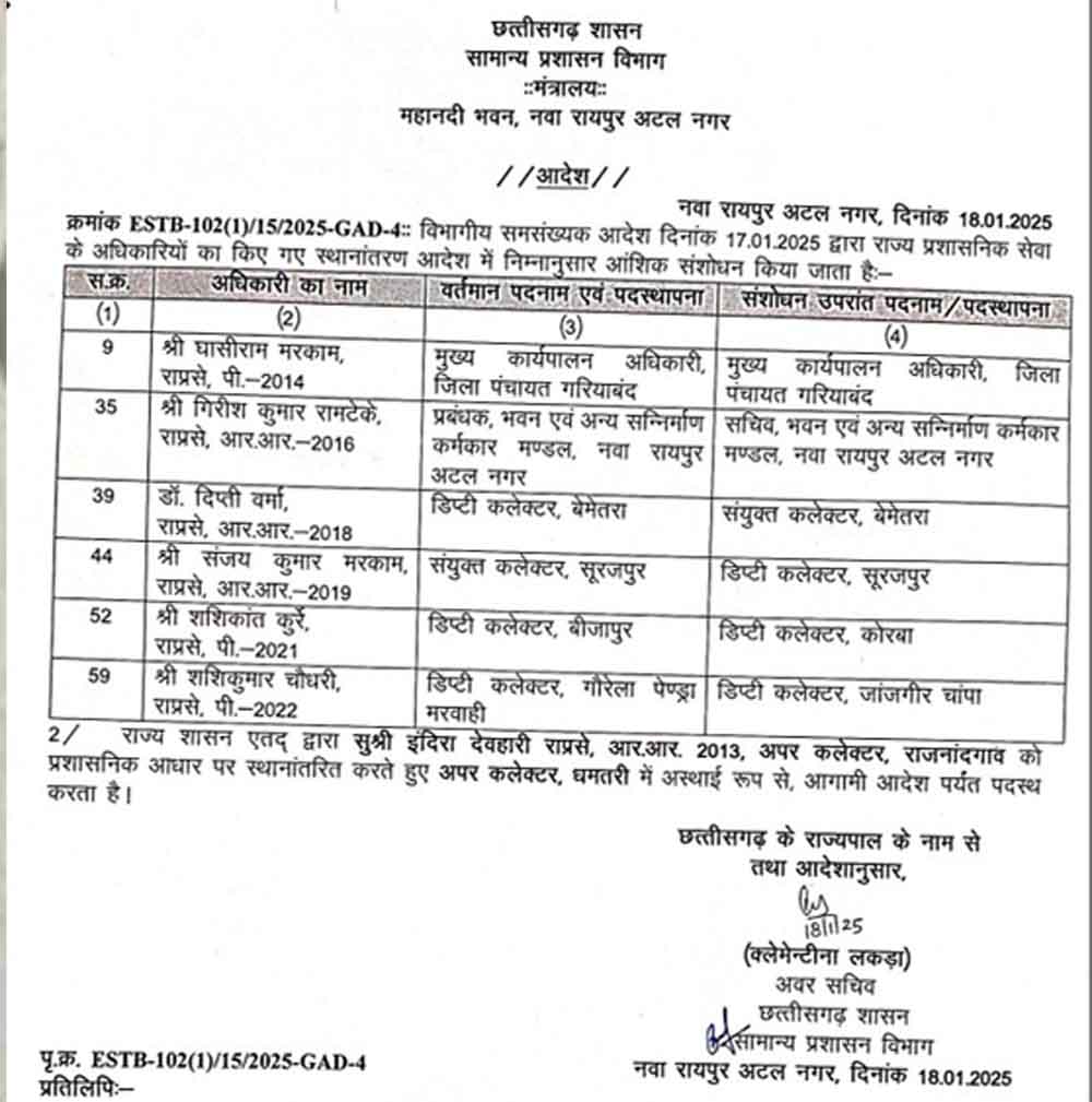 आचार संहिता से पहले नियम ताक में रखकर धमतरी अपर कलेक्टर को गृह जिला गरियाबंद में जिला पंचायत सीईओ की नियुक्ति पर कांग्रेस ने भी सवाल उठाया था. कलेक्टर एवं जिला निर्वाचन अधिकारी की ओर से जारी आदेश में कहा गया है कि घासीराम मरकाम, मुख्य कार्यपालन अधिकारी, जिला पंचायत गरियाबंद को त्रिस्तरीय पंचायतों के आम निर्वाचन 2024-25 के तहत जिला पंचायत के निर्वाचन के लिए संपूर्ण जिला गरियाबंद के लिए रिटर्निंग ऑफिसर (पंचायत) नियुक्त किया गया था. उक्त आदेश में संशोधन करते हुए मरकाम के स्थान पर ऋषा ठाकुर, अपर कलेक्टर गरियाबंद को त्रिस्तरीय पंचायतों के आम निर्वाचन 2024-25 हेतु जिला पंचायत के निर्वाचन के लिए संपूर्ण जिला गरियाबंद के लिए रिटर्निंग ऑफिसर (पंचायत) नियुक्त किया गया है. बता दें कि गरियाबंद जिले में सरकार ने धमतरी जिले में पदस्थ 2014 बैच के जिस राज्य प्रशासनिक सेवा के अधिकारी घासी राम मरकाम को जिला पंचायत सीईओ के रूप में पदस्थ किया गया था. वे इसी जिले के रहने वाले हैं. चुनाव आयोग के प्रावधान के मुताबिक, चुनाव के समय गृह जिला में अफसरों की पोस्टिंग वर्जित माना गया है. जानकारी के मुताबिक मरकाम गरियाबंद तहसील के मोहदा ग्राम के रहने वाले हैं, जबकि इनका ससुराल मैनपुर तहसील के जिडार पंचायत का चिह्रापारा है. मरकाम व उनके परिवार का दोनों तहसील में पुश्तैनी जमीन जायदाद भी है. भरे पूरे परिवार में एक भाई पंचायत सचिव भी है. नगरीय निकाय और पंचायत चुनाव के लिए प्रदेश में आचार संहिता लग गया है. ऐसे में अब इनकी नियुक्ति पर कई सवाल खड़े हो रहे थे.