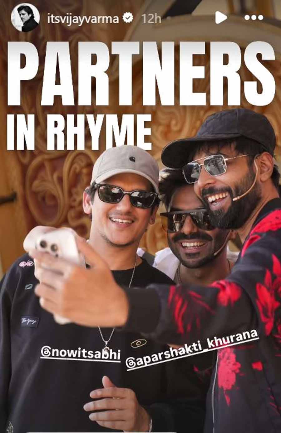 पहली फोटो में वह बैकस्टेज पर हैं, जबकि दूसरी फोटो में उन्हें होस्ट मोड पर देखा जा सकता है। एक तस्वीर में विजय स्त्री एक्टर्स अभिषेक बनर्जी और अपारशक्ति खुराना साथ पोज देते हुए नजर आ रहे हैं। इसके साथ उन्होंने कैप्शन में लिखा, "पार्टनर्स इन राइम (तुकबंदी में पार्टनर्स)।" वह आईफा की शूटिंग के लिए जयपुर भी पहुंच गए हैं, जहां अवॉर्ड फंक्शन होस्ट होने वाला है।