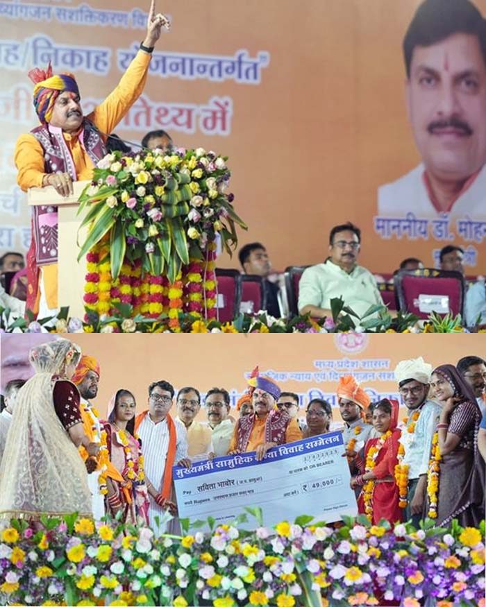 मुख्यमंत्री डॉ. मोहन यादव ने कहा है कि झाबुआ में एक साथ लगभग दो हजार जोड़ों के सामूहिक विवाह में शामिल होने का आनंद अदभुत और अविस्मरणीय है। उन्होंने नव-विवाहित जोड़ों को आशीर्वाद देते हुए सभी के मंगलमय और सुखद दांपत्य जीवन की कामना की। मुख्यमंत्री डॉ. यादव ने कहा कि मनुष्य जीवन के 16 संस्कारों में से पाणिग्रहण संस्कार गृहस्थ जीवन में प्रवेश के लिए महत्वपूर्ण संस्कार है। इसमें 7 फेरों से 7 वचनों को पूरा कर सात जन्मों तक बंधन में बंधते हैं। उन्होंने मुख्यमंत्री सामूहिक विवाह/निकाह सम्मेलन में शामिल जोड़ों को विवाह और निकाह की बधाई देते हुए सभी के जीवन में खुशियों की कामना की। मुख्यमंत्री डॉ. यादव झाबुआ में सामुहिक विवाह समारोह को संबोधित कर रहे थे।